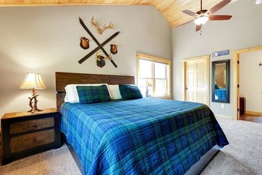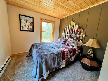 - “White Heat” large private primary suite with cathedral ceilings, modern rustic memory foam king bed, 75” plasma TV, ceiling fan, dresser, & blackout window shades.