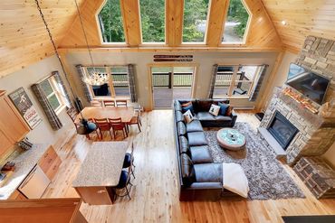 - Open living area centered around the cozy gas field stone fireplace, 60” plasma TV, & new 8 seat oversized leather sectional sofa with queen sleeper.