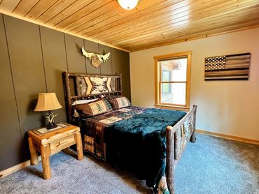 - “Obsession” bedroom with hickory log queen memory foam bed, 50” plasma TV, dresser, closet, & blackout window shades.